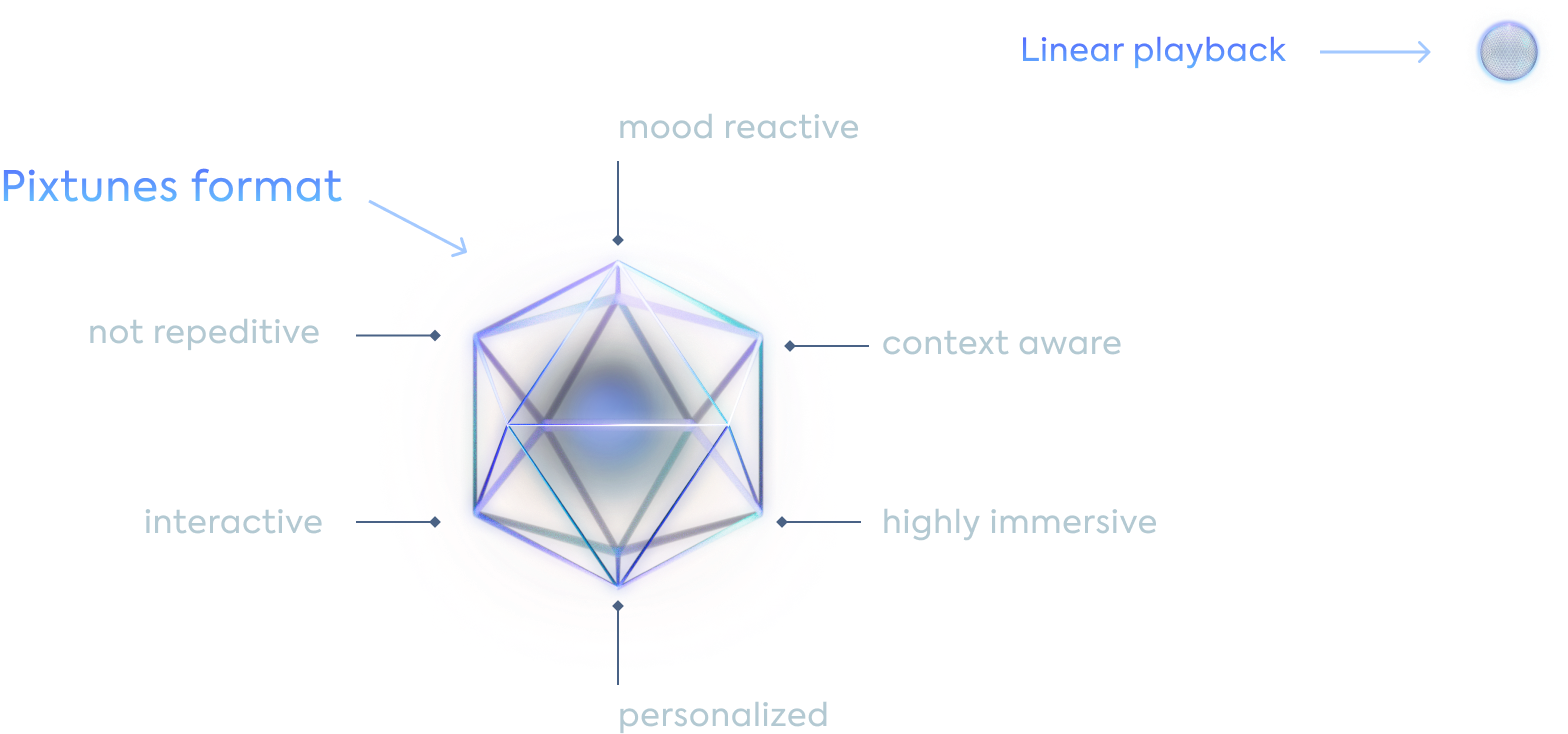 In our format, music and sound are rethought. A Pixtunes experience, is a constantly reinventing, highly responsive performance that sounds different each time the interaction changes. It adapts to the user and their context at any time and permanently generates the appropriate sound design to go with it.